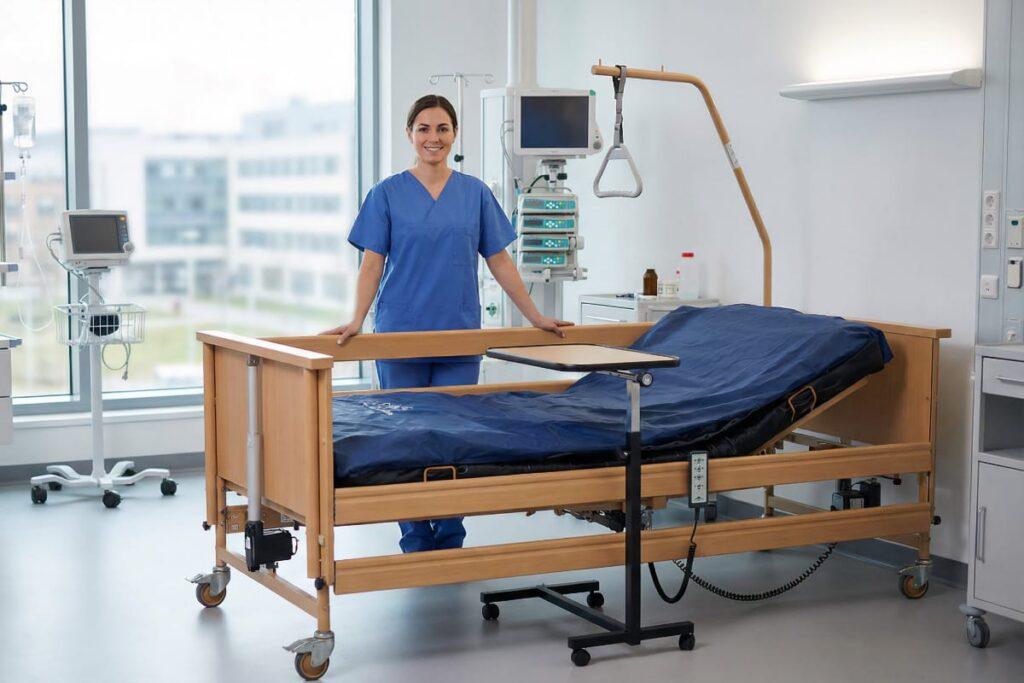 Medyczny stolik przyłóżkowy pełni funkcję stabilnej powierzchni roboczej bezpośrednio przy łóżku chorego. Służy przede wszystkim do spożywania posiłków, czytania, pisania oraz korzystania z urządzeń elektronicznych bez potrzeby wstawania z łóżka.